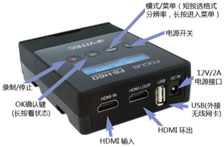 ?按鈕:電源按鈕,MODE(短按選分辨率,長(zhǎng)按進(jìn)入菜單),OK(確認(rèn)鍵,短按抓單幀,長(zhǎng)按顯示電量、輸入分辨率、日期時(shí)間),錄制按鈕接口:HDMI 1.3(內(nèi)嵌2通道音頻),環(huán)出HDMI,USB(外接無(wú)線網(wǎng)卡),電源口(DC 12V/2A......