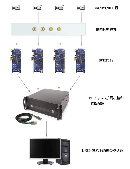 DVI2PCIe支持一機多卡,能從一臺機器同時采集多個信號源。 PCI Express擴展機箱與PCI Express主機適配器相連接,提供了大量的PCI插槽。將圖像采集卡插入這些插槽中,在啟動與DVI2PCIe卡數量對應的Epiphan捕捉工具應用的多個部分后,它便可以進行記錄。 DVI2PCIe卡為收集、保存視頻,同時保持較高的視頻質量提供了可靠的手段。