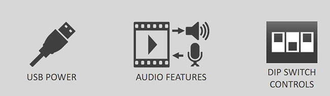 該非縮放轉換器基于功耗低和操作簡單而設計的,為了方便使用,轉換器可以通過任何USB2.0 / 3.0端口或附帶的外部其獨特的可鎖定USB電源線供電。音頻解嵌功能提供靈活性和額外工作流的選項。配置也很簡單,通過手動DIP開關設置。