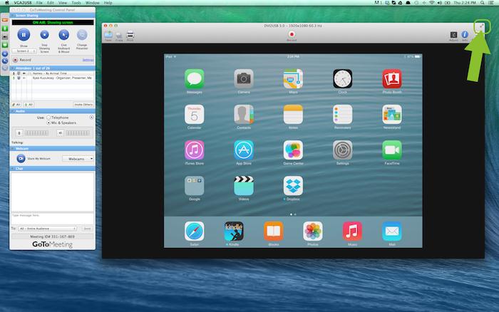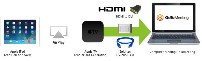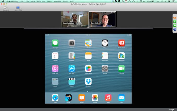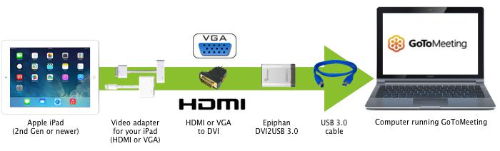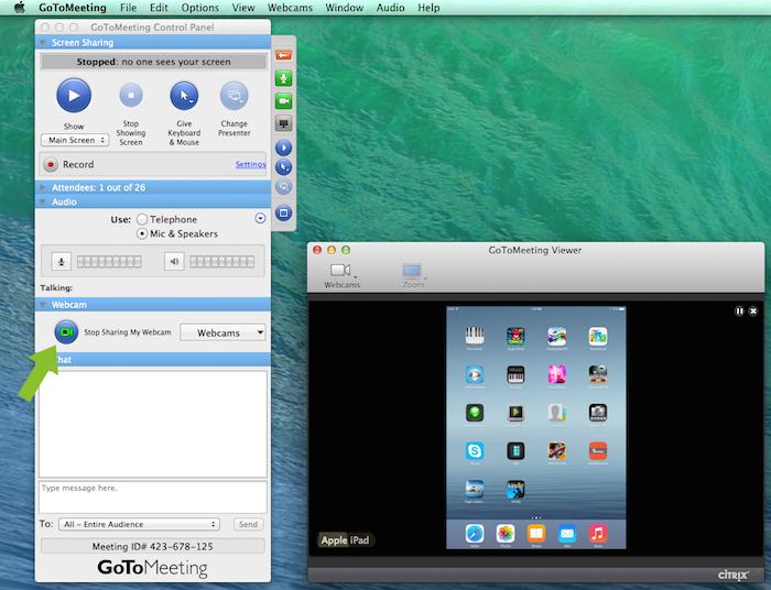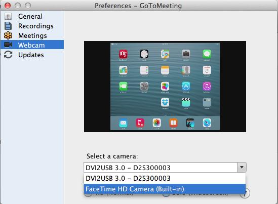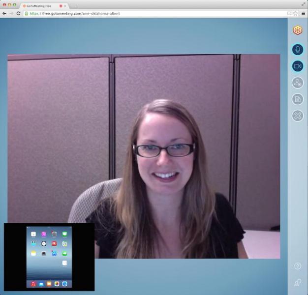 GoToMeeting的高級版使用戶能夠在同一時間分享他們的攝像頭和桌面屏幕。使用一個Epiphan幀或視頻捕獲器,您可以共享一個iPad屏幕像一個攝像頭或是“桌面”。
