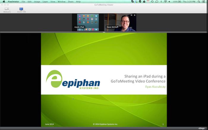 在GoToMeeting視頻會議期間,免費版本的GoToMeeting可以使用Epiphan幀或視頻采集器顯示iPad屏幕為一個網絡攝像頭。
