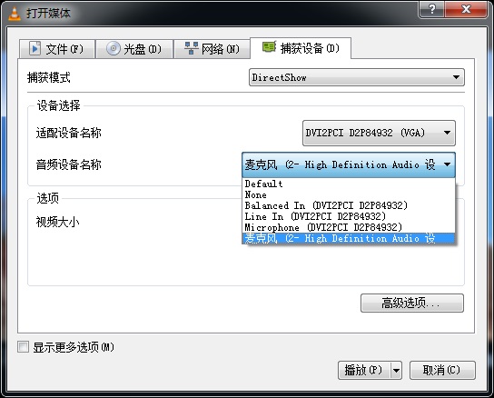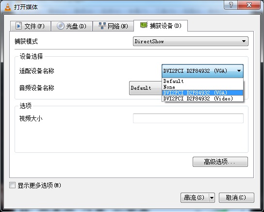 2. 在“捕獲設備”選項下的適配設備名稱后的板卡中選擇“DVI2PCI D2P……(VGA)”