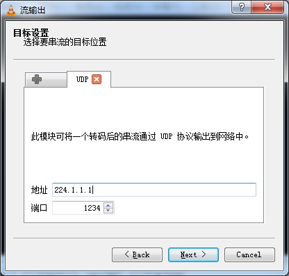 6.在地址欄中輸入UDP組播的IP地址,例如:224.1.1.1,端口:1234,點擊“Next”下一步。
