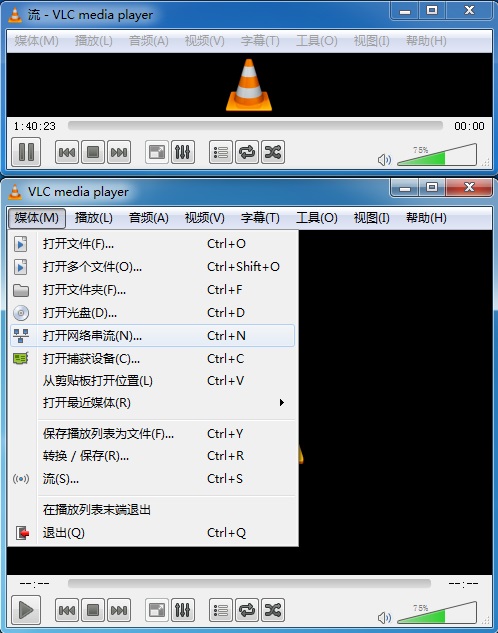10.此時,另外打開一個VLC播放器,選擇“打開網(wǎng)絡串流(N)…”菜單