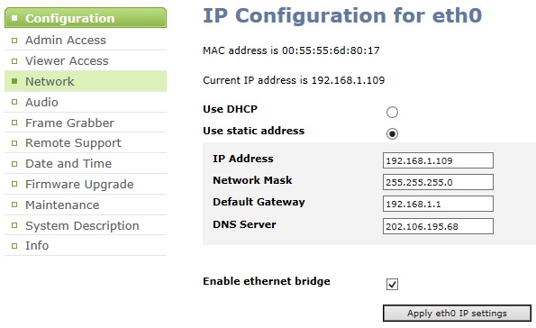 3. 點(diǎn)擊左側(cè)菜單欄中的“Network”,設(shè)置為固定IP地址及相關(guān)參數(shù),點(diǎn)擊“Apply eth0 IP Settings”保存設(shè)置,重啟即可生效;若啟動(dòng)網(wǎng)橋功能則勾選“Enable Ethernet bridge”,此時(shí)再將電腦的IP改回局域網(wǎng)中,電腦即可通過(guò)Ethernet的Eth2口上網(wǎng)。