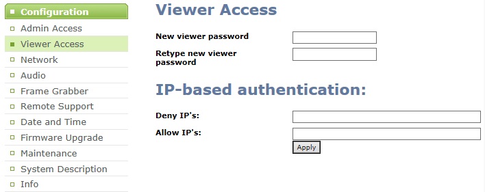 5. 在WEB管理的“Viewer Access”菜單項(xiàng)中,可設(shè)置禁止或充許訪問(wèn)的客戶端IP,或設(shè)置訪問(wèn)者的密碼。