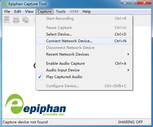 9. 打開(kāi)自帶軟件“Epiphan Capture Tool”,點(diǎn)擊“Capture”-“Connect Network Device…”連接網(wǎng)絡(luò)設(shè)備。