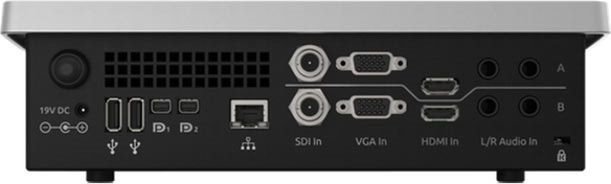 背面板上有電源按鈕,電源適配器的接口,2個USB接口,2個DP接口,1個RJ45網絡接口,2個高標清的3G-SDI接口,2個VGA接口,2個HDMI接口,4個兩組大三芯左右聲道音頻輸入。