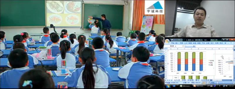 下面我們來看一下模似實際環境中的應用,將錄教師的攝像機HDMI輸出接入到Pearl的A組HDMI輸入,錄學生課堂攝像機的SDI輸出接入到B組SDI輸入,教師機電腦屏幕的VGA信號接入到A組的VGA輸入,如此一來,我們便可模似出一個三分屏的通道畫面。