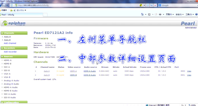 左側菜單欄又有五大菜單組成:1、通道菜單,用于添加輸入源及設置通道參數;2、記錄存儲菜單,用于添加記錄存儲通道,存儲某一通道,或是將多個通道存儲為一個文件;3、源設置菜單,用于設置信號源的旋轉及亮度偏移等一些參數;4、配置菜單,用于配置系統的IP,日期時間,升級,外部存儲,推送到服務器,設置權限,查看狀態等;5、內部存儲狀態菜單,用于顯示內部存儲的總空間,已用空間及剩余空間。