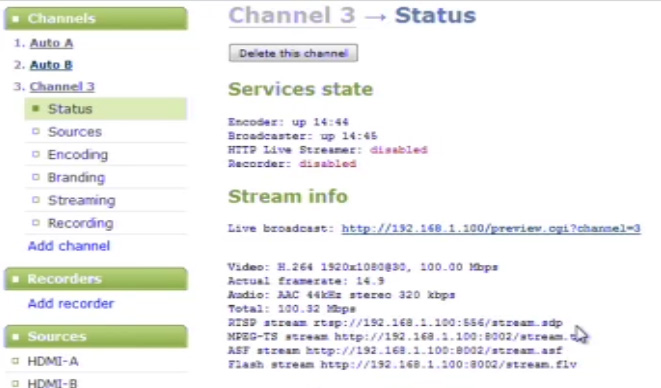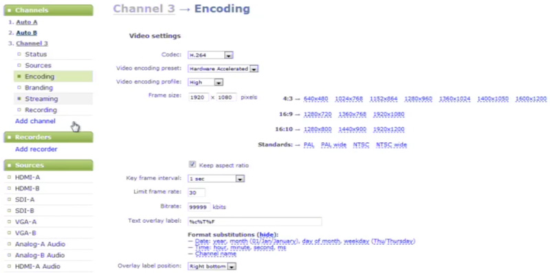 然后在左側新添加通道下的“Encoding”項中設置編碼的一些詳細參數,例如:編碼格式,分辨率,幀速率,碼率,疊加日期時間及通道名稱和音頻參數等。還可以在“Branding”項中加入作者,標題等一些logo標信息,在“Streaming”項中設置蘋果接收流的協議或是發布到服務器的方式,在“Recording”項中設置記錄存儲的文件格式(avi,mpeg-ts,mov,mp4)等。