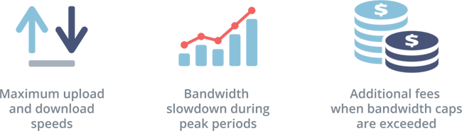 許多ISP商都會有更大速度上傳和下載帶寬說法。例如,一個互聯網商可能會被宣傳為“高達10 Mb / s,30 Mb / s!”, 使用這種特定的“更多”措辭,因為互聯網速度可能會有所不同。 例如,如果使用有線網絡,您正在與地理區域內的其他有線用戶共享互聯網,因此在白天的“高峰期”互聯網活動期間,您的帶寬可能會減慢。