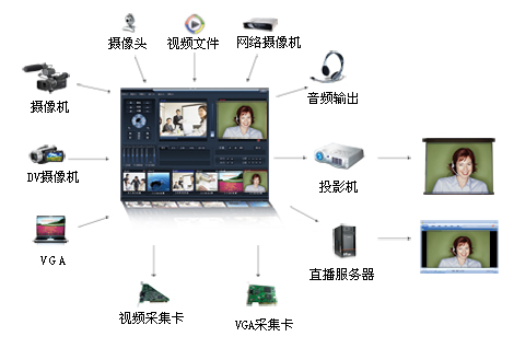 PowerCreator Media Cast 是一套具備多媒體數據(視頻、音頻、VGA、文本、圖片等)實時切換與錄播功能的系統軟件,實現了調音臺、切換臺、字幕機等傳統硬件錄播設備的主要功能,適用于教學現場錄播、網絡電視臺錄播等場合,為教育、廣電、政府、企業等行業用戶多媒體信息化建設的首選方案。 智能導播系統結構圖如下所示: |