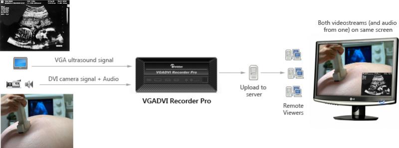 這種記錄和廣播解決方案很容易連接到超聲波機來捕獲所需的圖像。并且可以同時從兩個來源捕獲并記錄視頻。此功能對于我們是非常重要的。我們不僅要獲得機器的超聲圖像,我們也希望展示超聲檢查操作者如何將醫療果凍膠放在皮膚上,以及探頭如何在他/她的皮膚上移動,一邊獲取所需的圖像,還有病人如何改變身體位置等,利用連接著攝像機的VGADVI Recorder Pro這可以很容易地實現。該設備將視頻從兩個數據源結合到一個文件中,并增加了一個音軌用于評論和解釋。