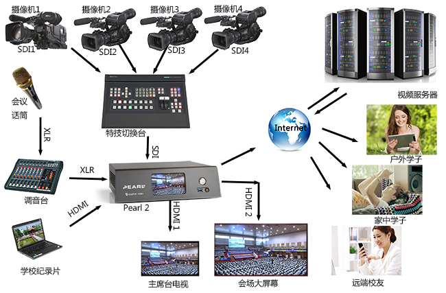 大會期間采用了4臺攝像機進行全程多角度拍攝,后將信號傳輸給特技切換臺,再由切換臺輸出視頻給Pearl 2。音頻通過會場調(diào)音臺輸出接入Pearl 2的平衡音頻輸入,通過自由搭配音頻源,保證了音頻的無雜音效果。后將播放學(xué)校紀(jì)錄片視頻的筆記本電腦HDMI輸出給Pearl 2的HDMI輸入,并通過本身的導(dǎo)播切換功能實現(xiàn)攝像機與紀(jì)錄片視頻的無縫切換。再將Pearl 2的兩個HDMI輸出一路給主席臺的電視供主持人監(jiān)看,一路給會場的大屏供全場人員觀看,最后將視頻流推到校園的視頻服務(wù)器上,供未能到場的校友,教師及學(xué)子觀看。